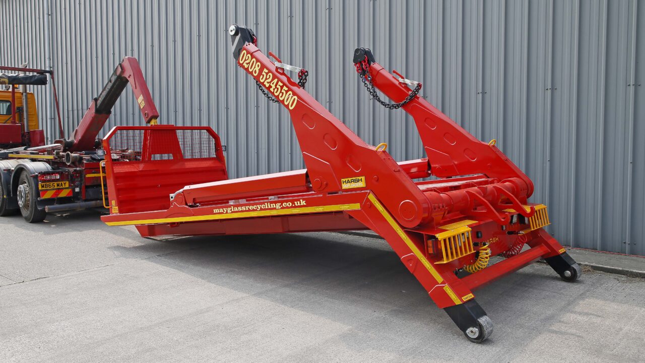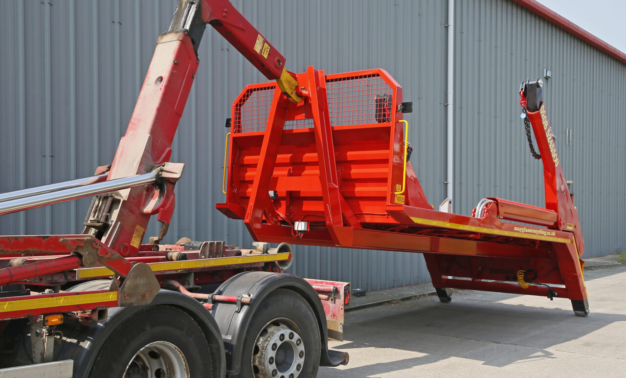 May Glass Recycling的基本车辆是近5岁6×2沃尔沃FM,配有传统的钩形车身。苛刻的内置定制可拆卸的Skiploader单元,可以装载到卡车上,好像它是标准的挂钩器容器。然后,操作Skiploader的液压可以简单地连接到卡车现有的系统中。整个过程需要5分钟。